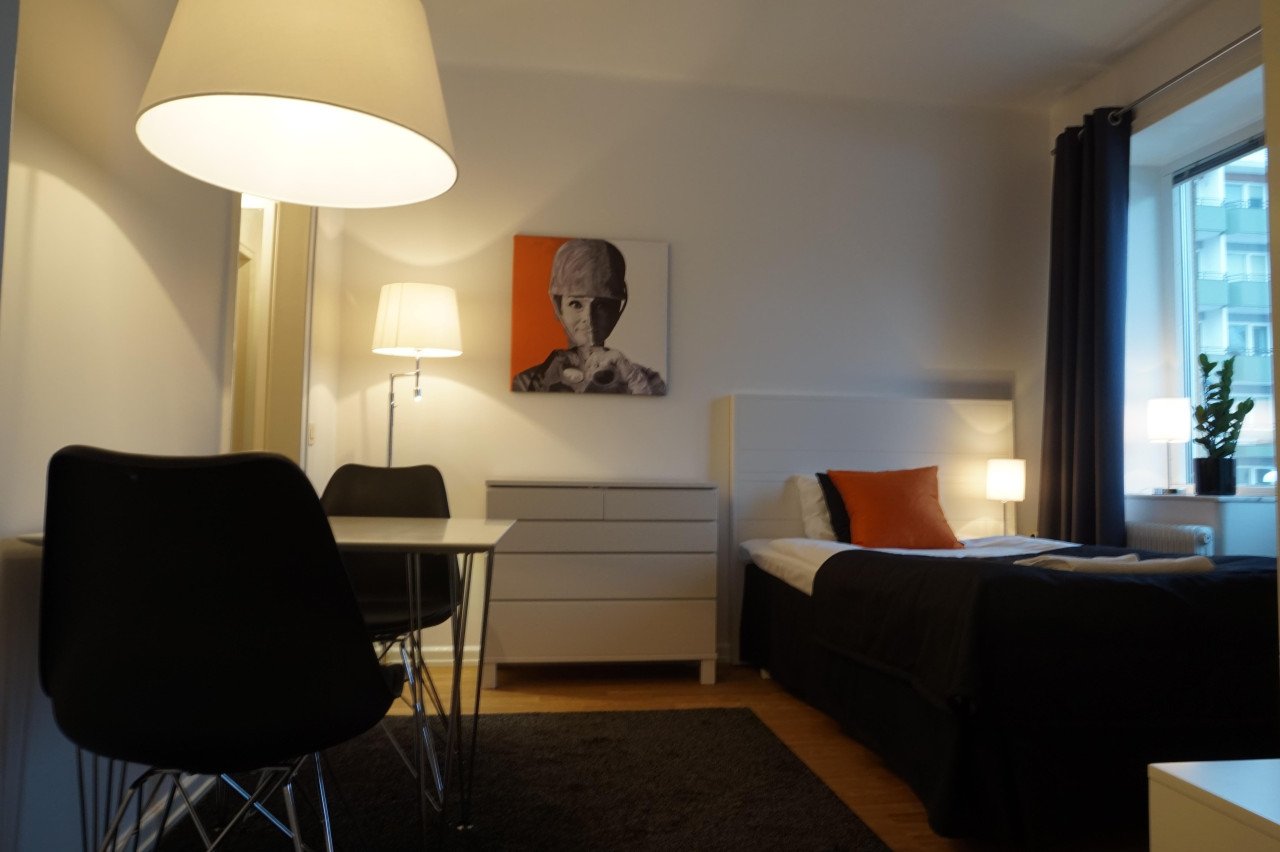 The apartments are in a beautiful, round wooden building with a colorful inner yard. The building itself is a site to see. In proximity you will find restaurants, grocery stores, parks, and the open-air museum. The main city center is only a 15 minutes’ walk away, where you can see Stora Torget, The Cathedral and much more. The fully furnished apartments of 34 sq-m have an interior that gives a homey feeling. The kitchen is equipped with the basics you need to prepare a meal, a 120 cm bed for a good night’s sleep, a private bathroom and free Wi-Fi and TV. Parking in the basement garage can be booked for an extra fee.
